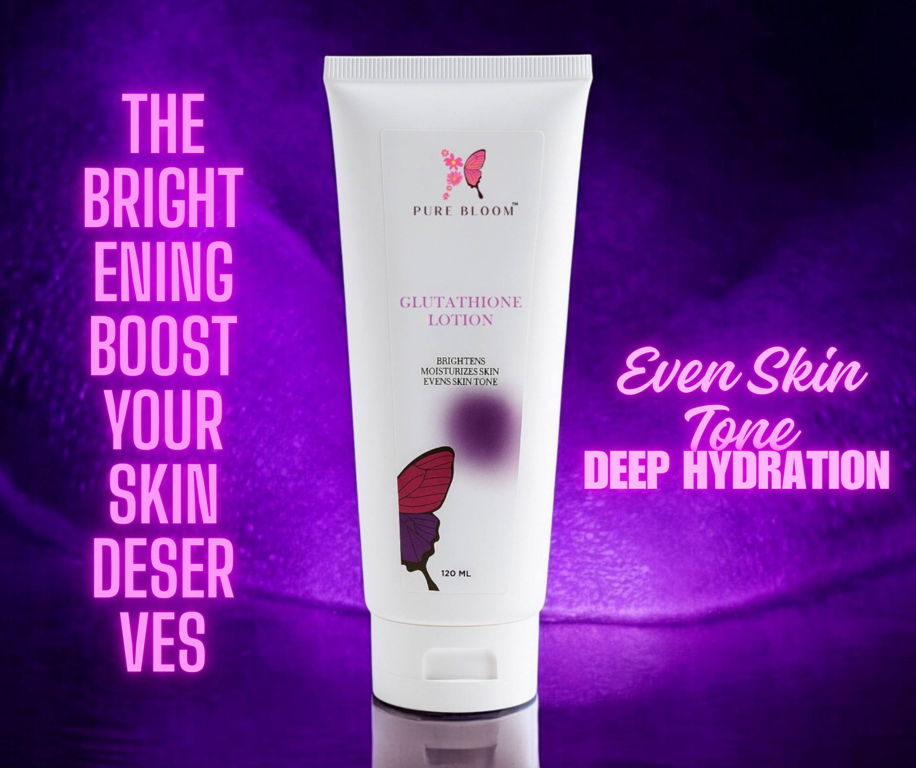 Pure Bloom Glutathione lotion helps brighten and even out skin tone, reducing dark spots and pigmentation. This powerful formula targets dullness, uneven texture, acne marks, and sun damage.