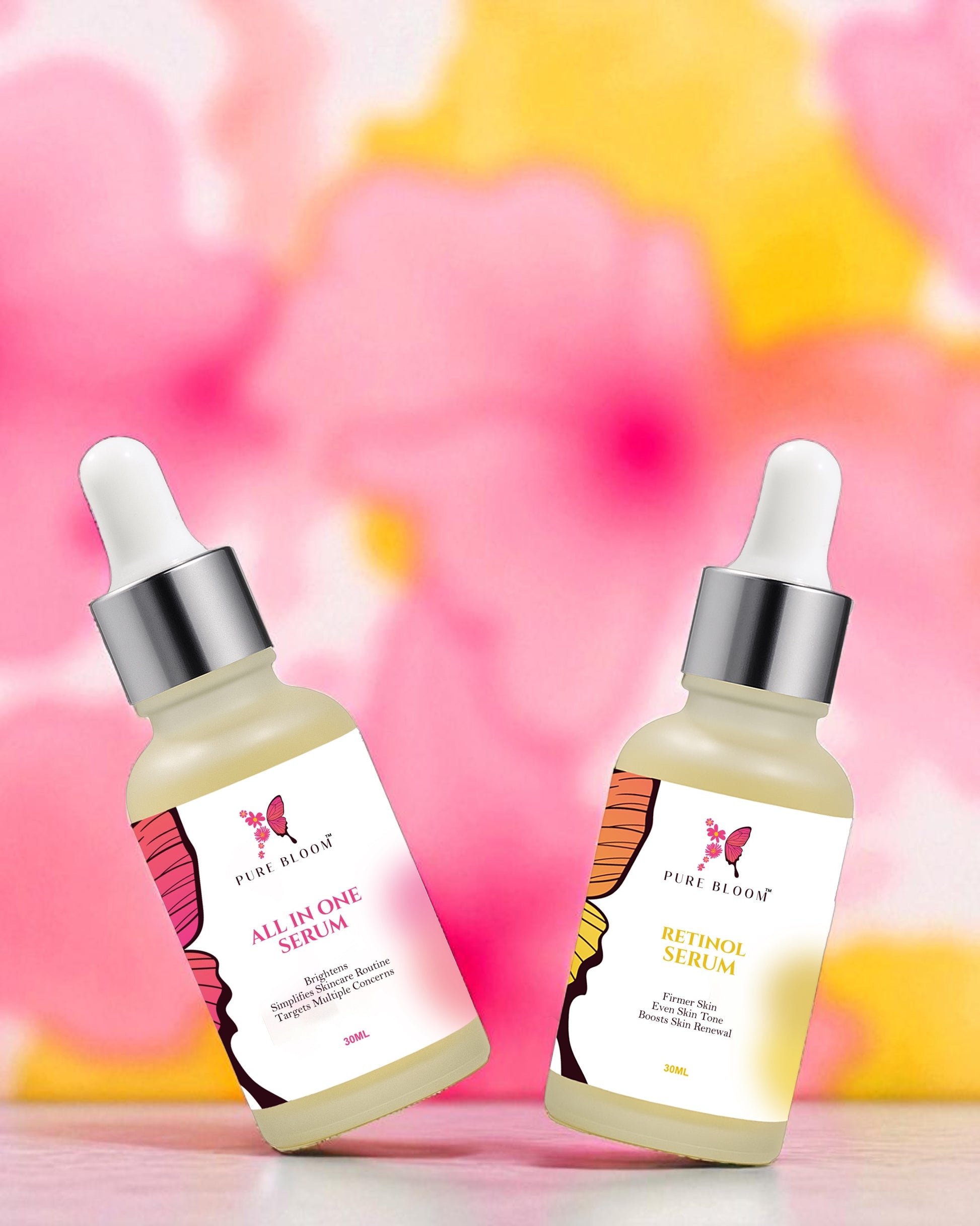The Glow Reset Set combines two skincare essentials for a complete routine. Use the All-In-One Serum in the morning to brighten, hydrate, and protect with Vitamin C, Niacinamide, and Hyaluronic Acid. At night, apply the Retinol Serum to smooth fine lines, refine texture, and support skin renewal while you sleep.